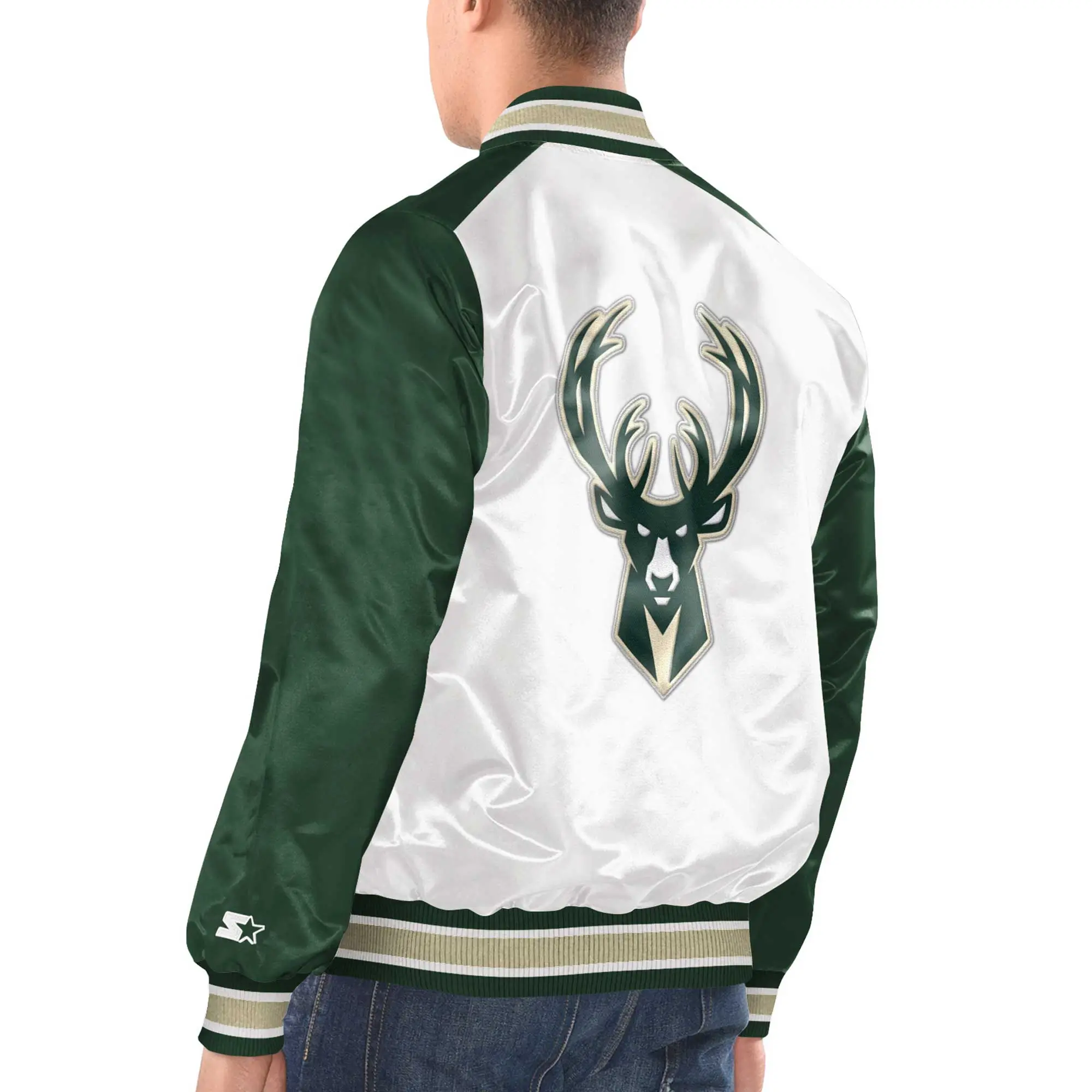 Milwaukee Bucks Starter White/Hunter Green Renegade Satin Varsity Jacket