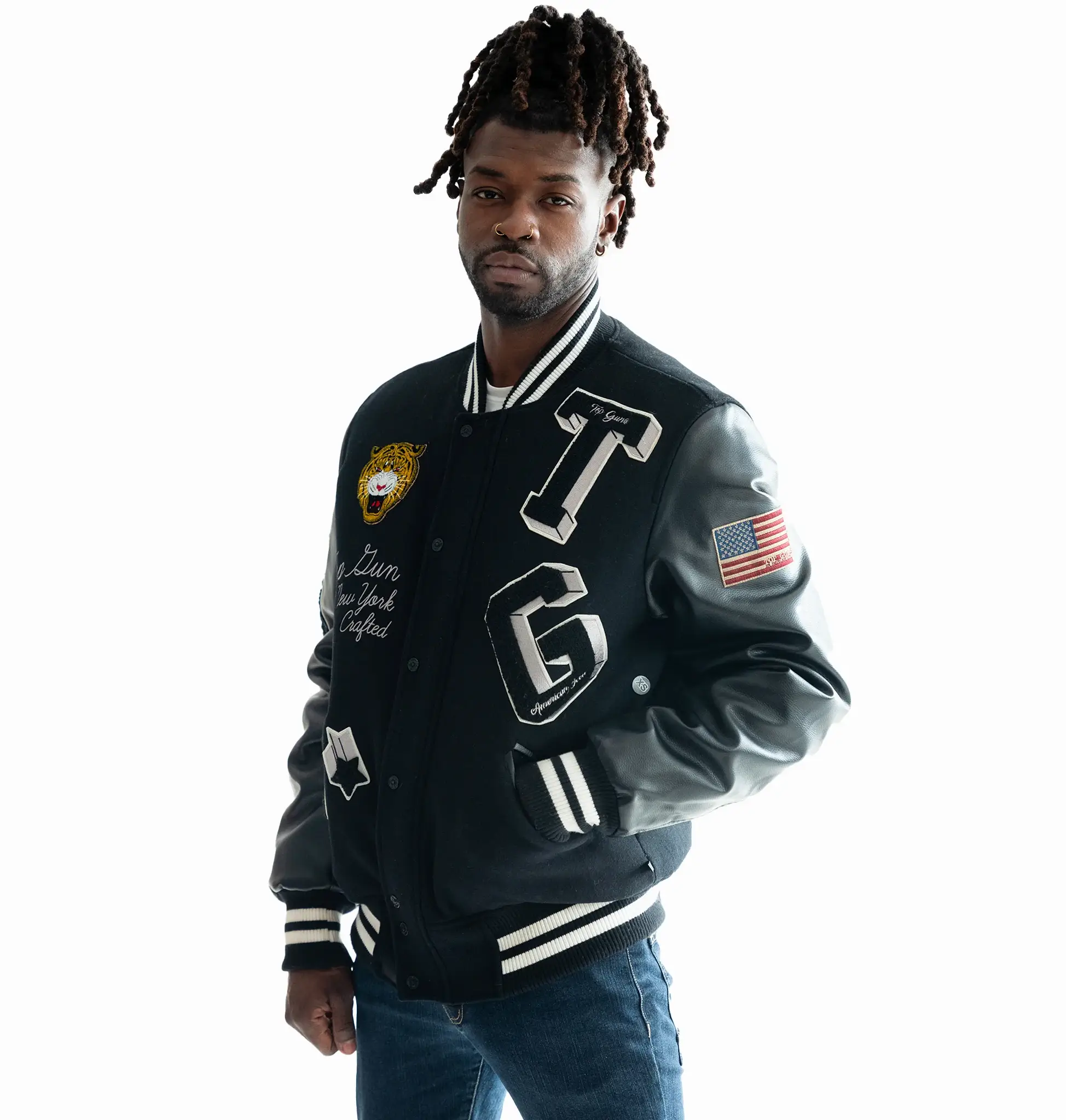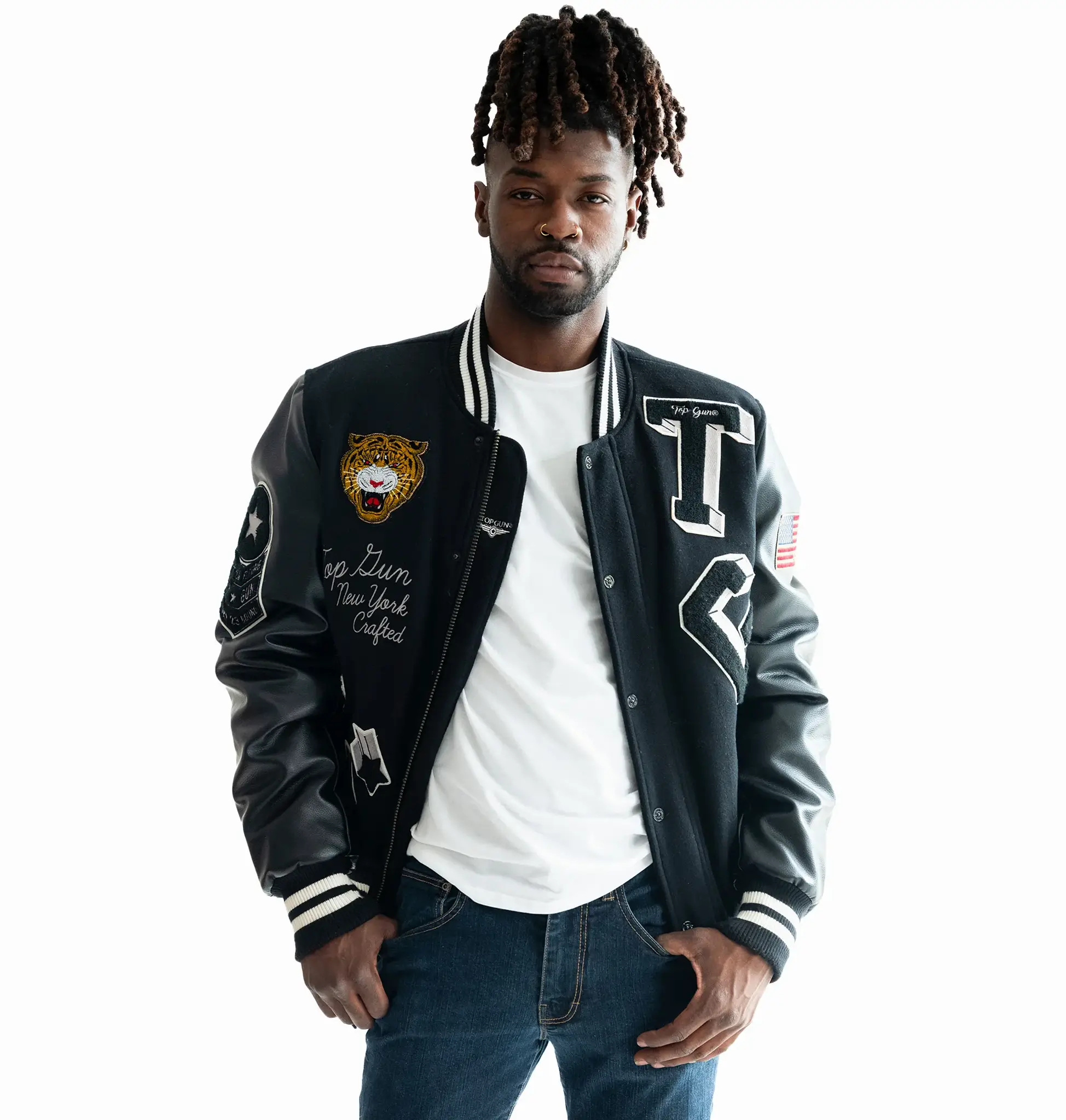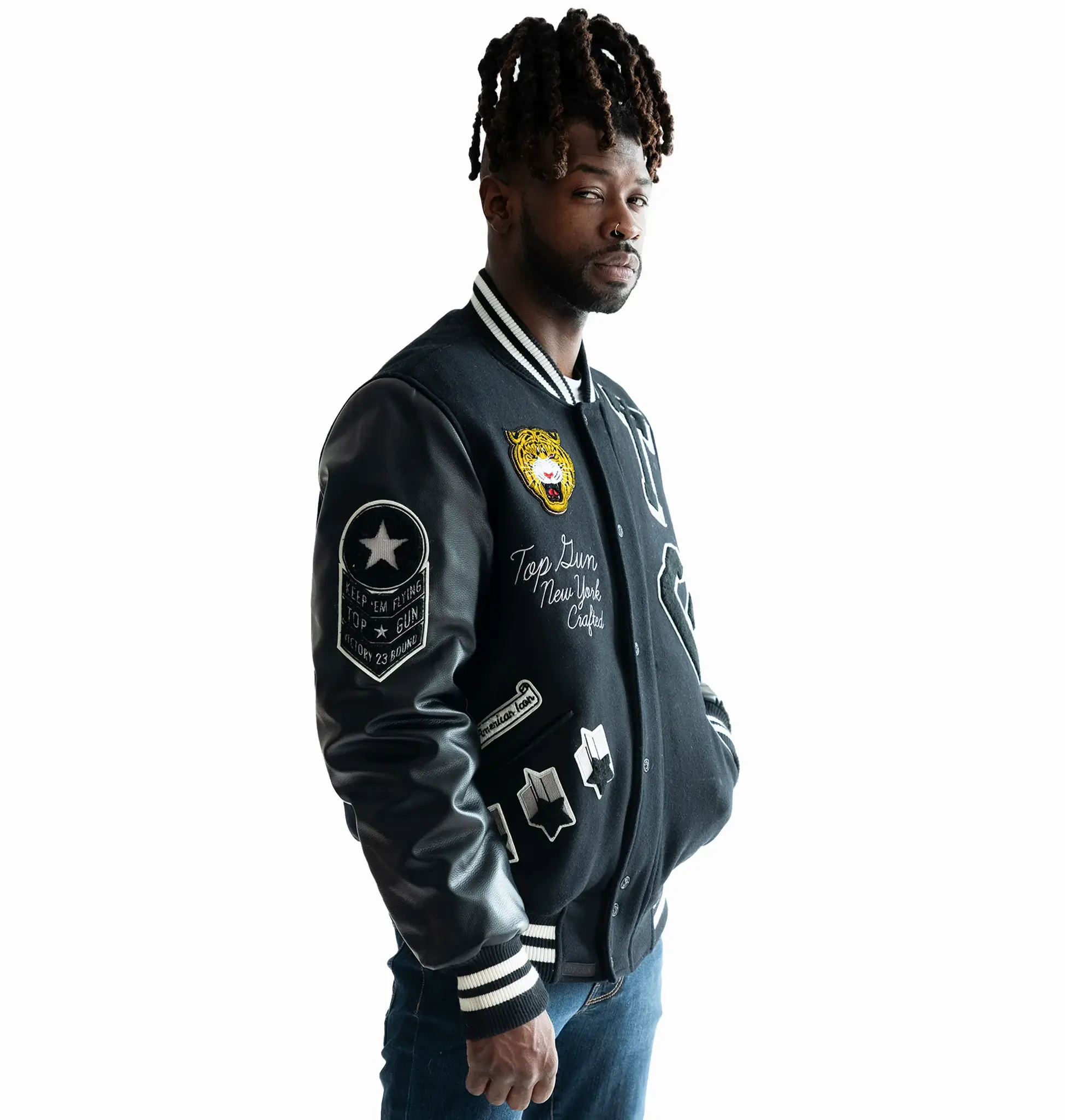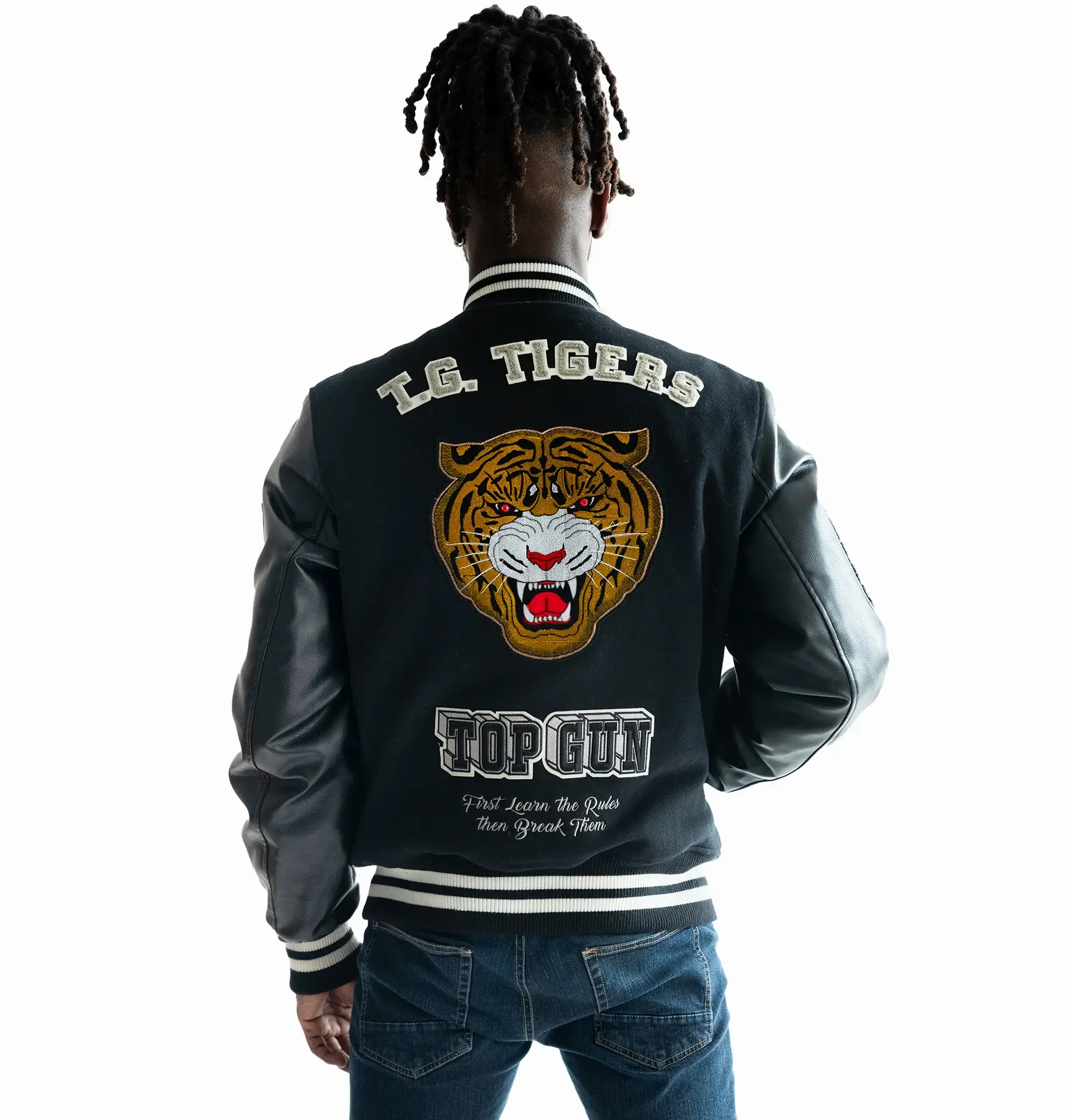 Top Gun Tiger Patch Black Wool & Leather Varsity Jacket